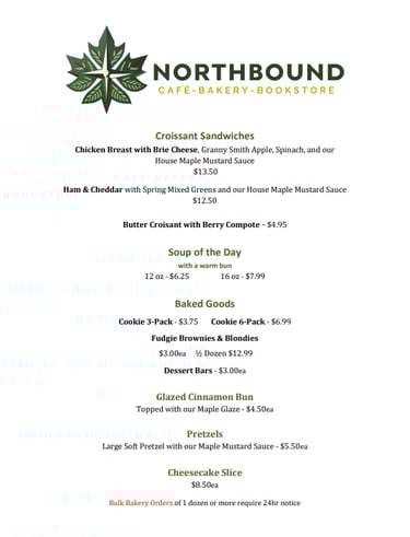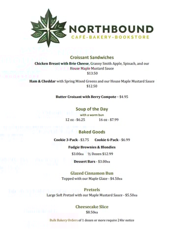 At Northbound Café & Bakery in Kenogami, Ontario, we serve up a fresh, comforting menu perfect for breakfast, lunch, or an anytime treat. Whether you're stopping in during your cottage commute, passing through on Highway 11, or a local looking for a cozy bite, we’ve got something for you.
